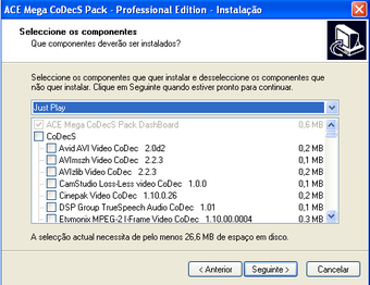 O processo de instalação do ACE Mega CoDecS Pack traz um assistente em português que facilita o trabalho. Basta selecionar quais componentes deseja instalar na lista e deixar que o aplicativo cuide do resto.